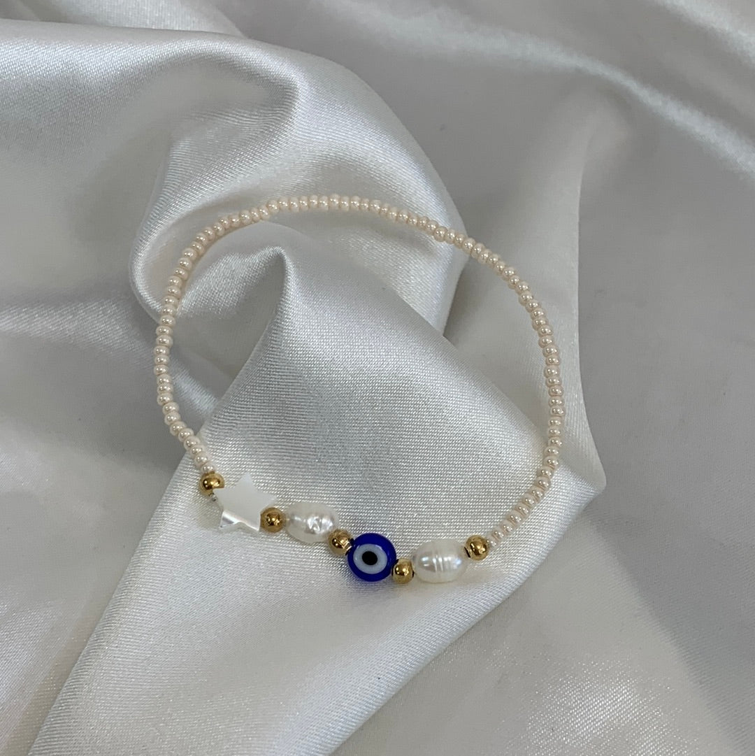 Incluye: Hilo elástico, chaquira color beige, ojito del color elegido, estrella madre perla, perlita natural y bolitas de chapa + bolsita de regalo.